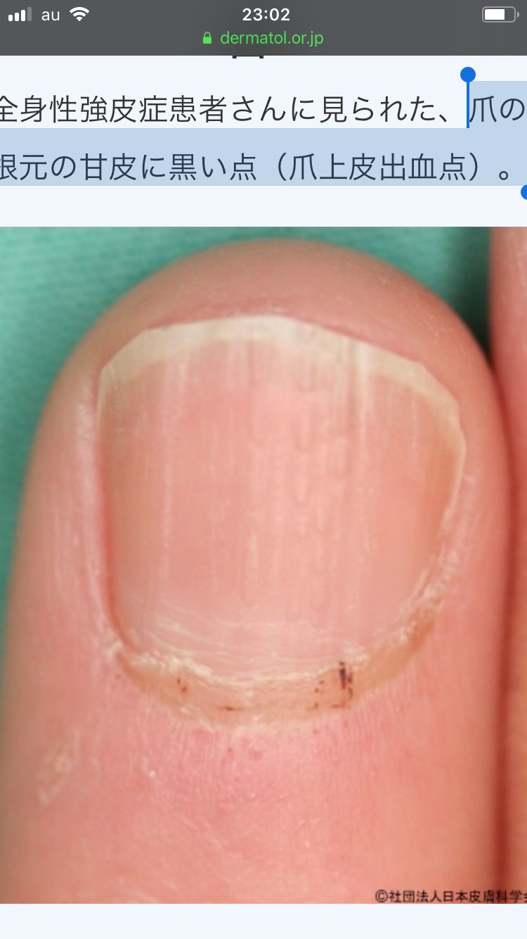野村俊一 On Twitter 膠原病 強皮症 による レイノー症状 を疑う重要な皮膚の変化が 爪上皮出血点 爪上皮出血点は指の爪 の甘皮の部分にみえる黒い出血点 レイノー症状に加えてこれがあれば 強皮症が疑われさらに詳しい血液検査が必要 レイノー症状のある方は自分で