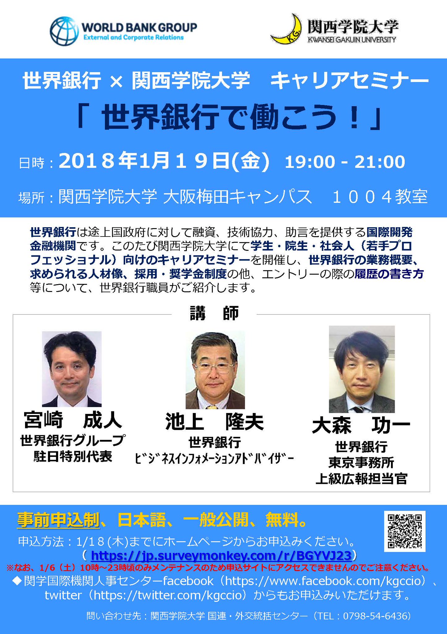 関西学院大学国際機関人事センター On Twitter 2018 1 19 金 世界銀行 関西学院大学 キャリアセミナー 世界銀行で働こう 開催 大阪梅田キャンパス 19時 21時 世界銀行の業務内容 採用 奨学金制度 エントリーの際の履歴の書き方などを世界銀行の方々より